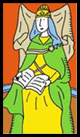 조용하게 앉아 있는 여자 교황.조용하고 침묵가운데 무엇인가를 지키고 있는 것처럼 보입니다. 이 카드는 무엇인가 말로 표현할 수 없는 것, 가슴가운데 살그머니 은밀한이라고 두어야 할 일이 있는 것을 암시하고 있습니다.